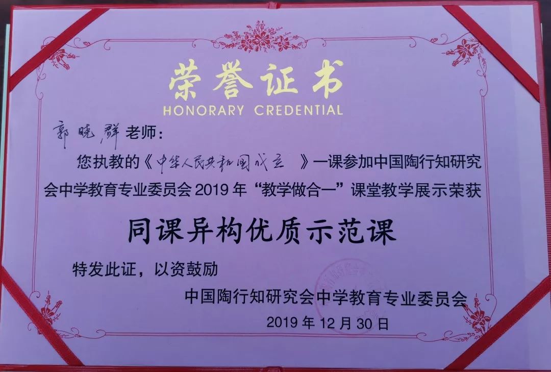 12月28日至31日,中國陶行知研究會中學教育專業(yè)委員會2019年全國學術(shù)年會在重慶市璧山中學隆重召開,來自全國20多個省(市)自治區(qū)的專家學者、教師代表近1000人出席了該年會。在年會課堂教學展示觀摩活動中,我校教師鄒玲、郭曉群所執(zhí)教的展示課被評為同課異構(gòu)優(yōu)質(zhì)示范課。